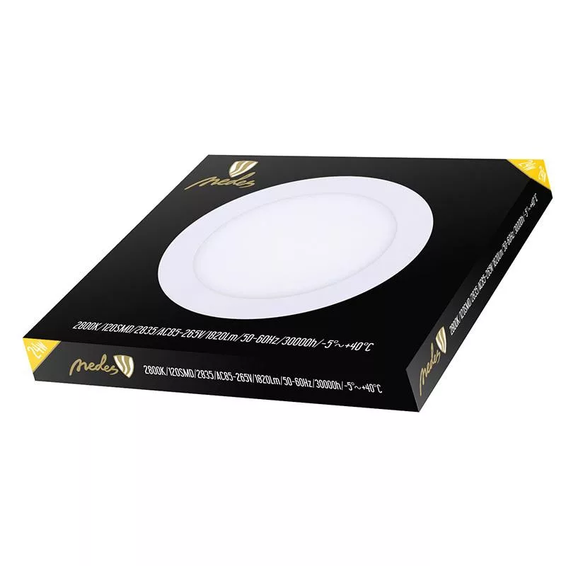 Műszaki jellemzők: 24W teljesítmény, 1820 lumen fényáram, 2800K meleg fehér színhőmérséklet, 120° sugárzási szög, AC85-265V feszültség, IP20 védettség. Anyaga fehér alumínium, opál búra, 582 g nettó súly, nem dimmelhető.