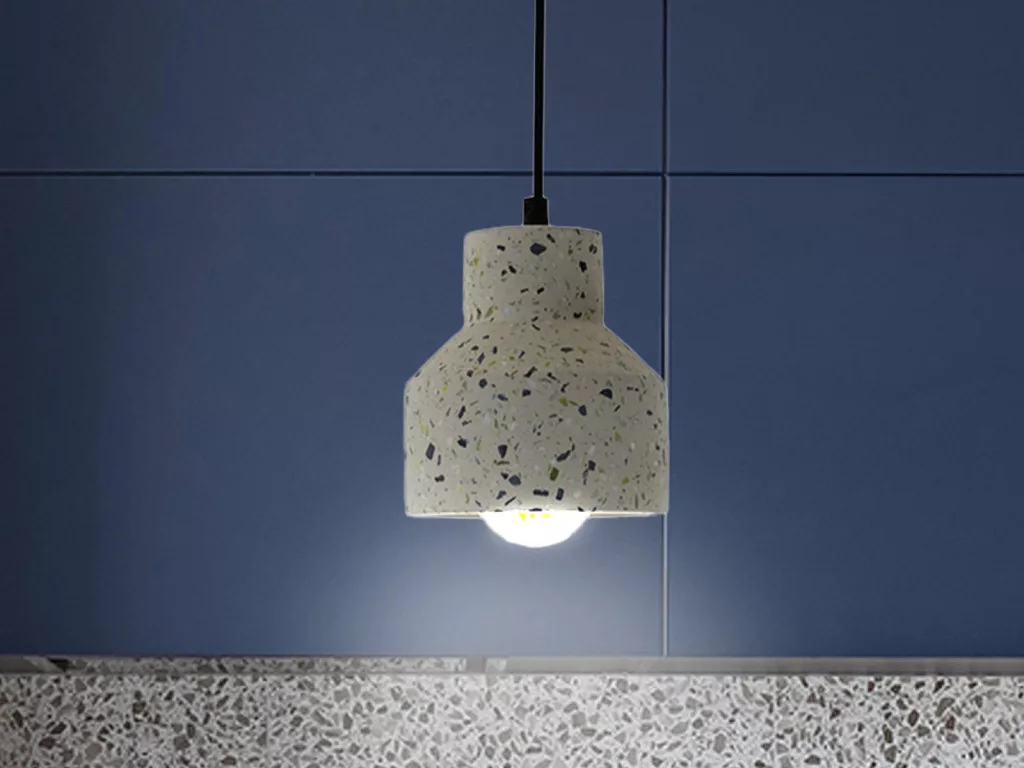 Modern, fehér terrazzo kivitelű függőlámpa fekete fém alkatrészekkel, mely időtálló megjelenéssel bír. Kiváló minőségű anyaghasználat jellemzi, így nappali, étkező vagy előszoba világítására is ideális választás.