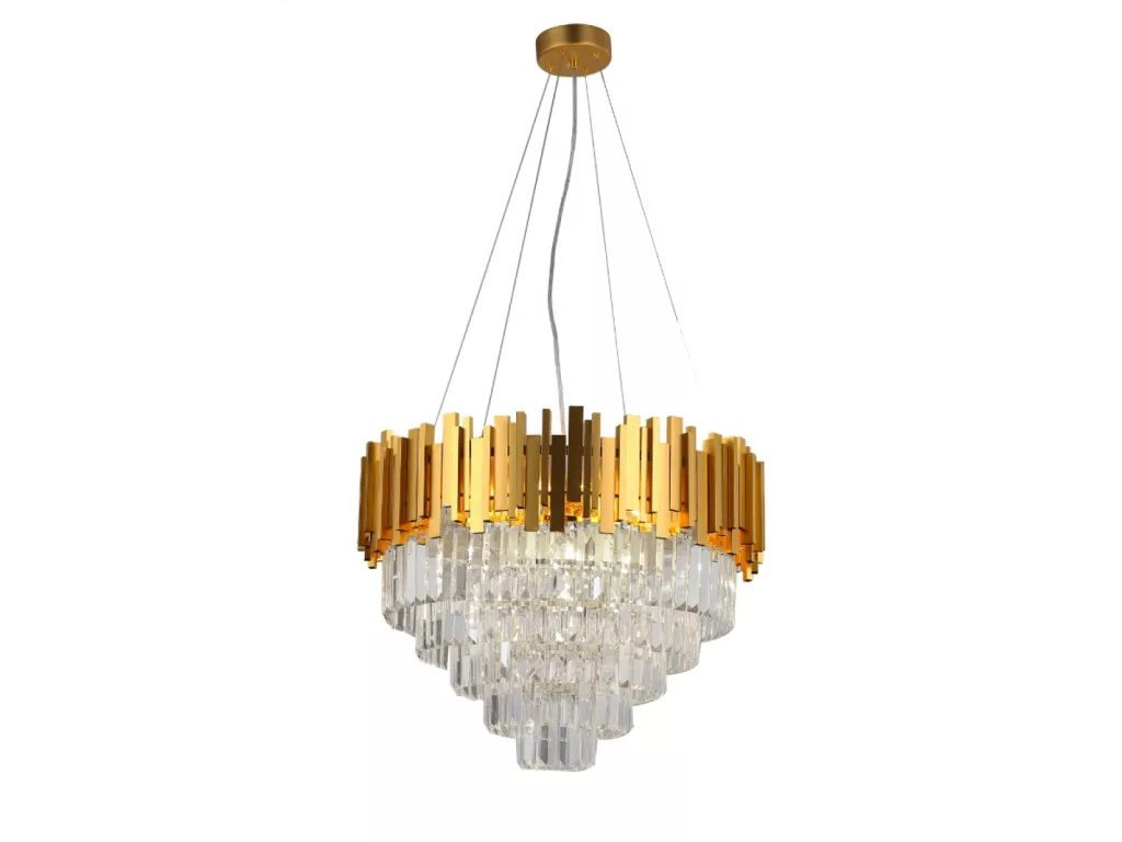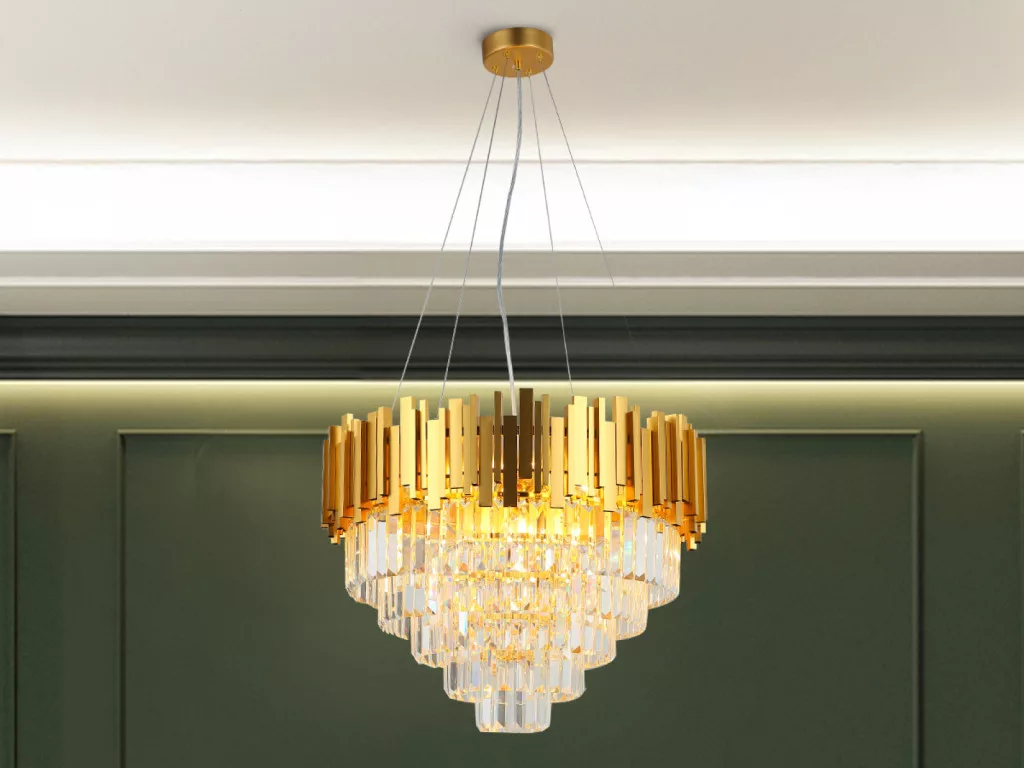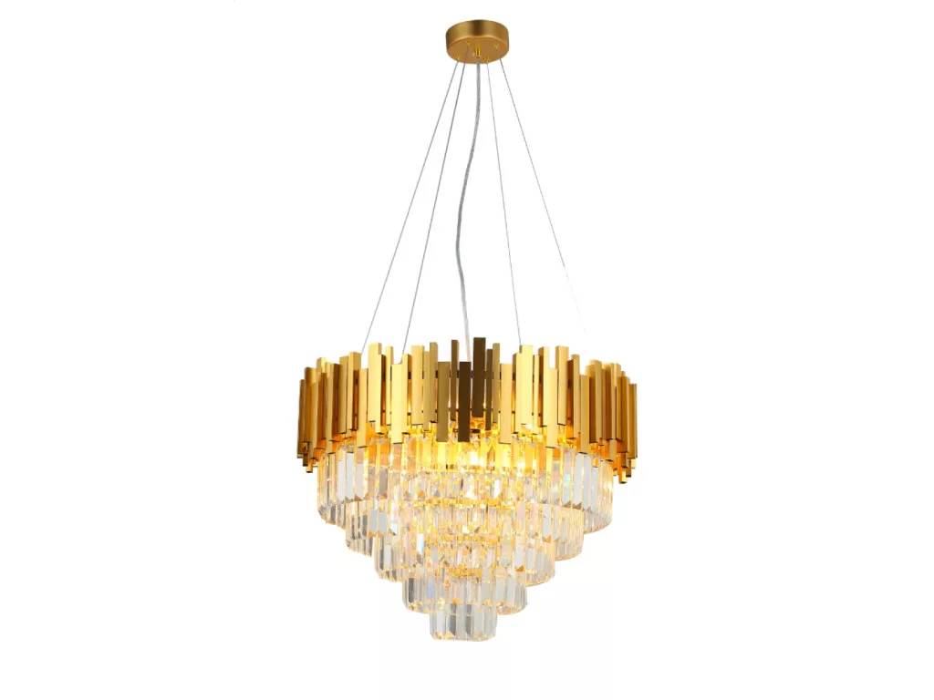 A lámpatest teste kiváló minőségű alumíniumból készült, elegáns arany árnyalatban, melyet gazdagon díszítenek finoman csiszolt kristályok. Ezek a kristályok szépen megtörik a fényt, ezzel egyedülálló és ragyogó fényhatást biztosítanak.