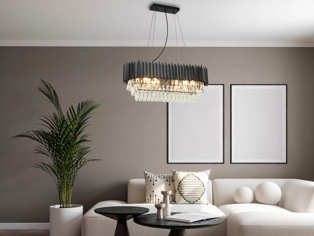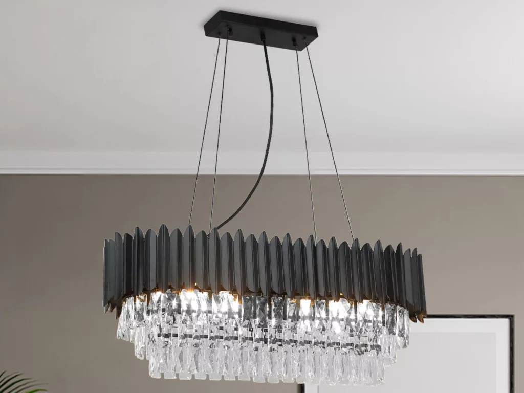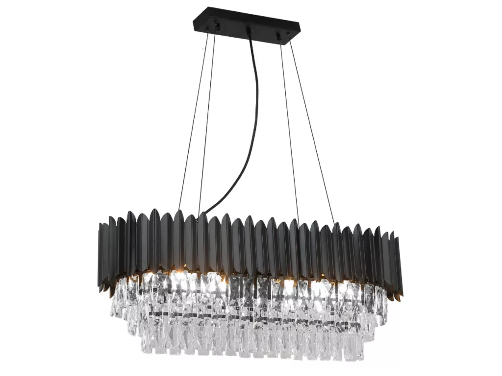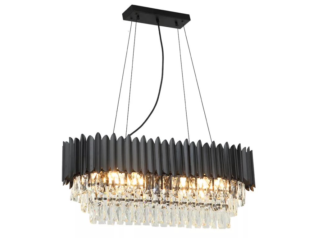 A csillár váza kiváló minőségű fém anyagból készült elegáns fekete színben. Felületét finoman csiszolt, gazdagon elhelyezett kristályok díszítik, melyek lenyűgözően törik meg a fényt, és egyedülálló világítási élményt teremtenek.