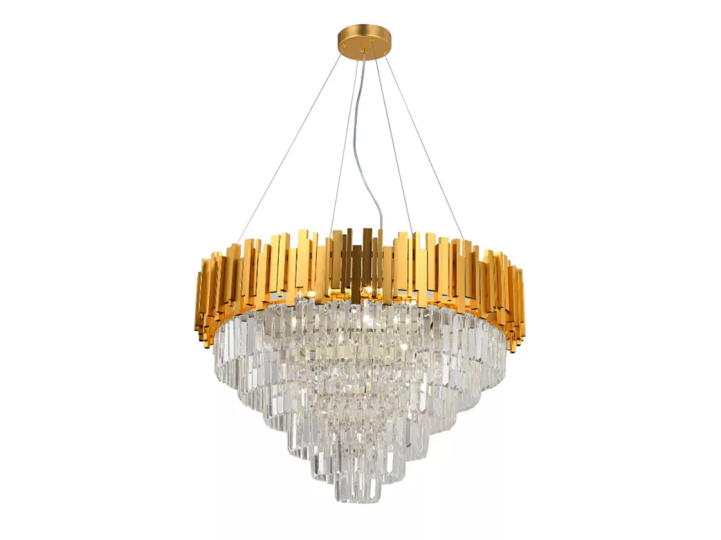 Ez a minőségi lámpatest ötvözi a modern formatervezést precíz, kézműves kidolgozással. A csillár alapja kiváló minőségű fém, elegáns arany árnyalatban, felületét finoman csiszolt kristályok díszítik, melyek gyönyörű fénytörést biztosítanak.