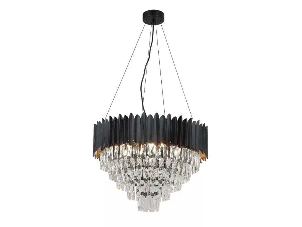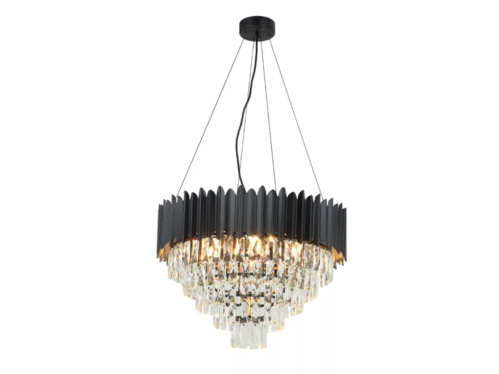 A csillár váza magas minőségű fém, elegáns fekete árnyalatban, amelyet finoman csiszolt kristályok díszítenek, ezáltal gyönyörű fénytörést és különleges világítási élményt biztosít.