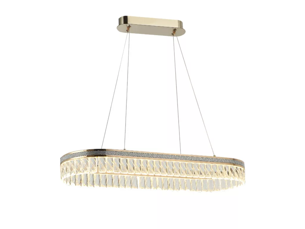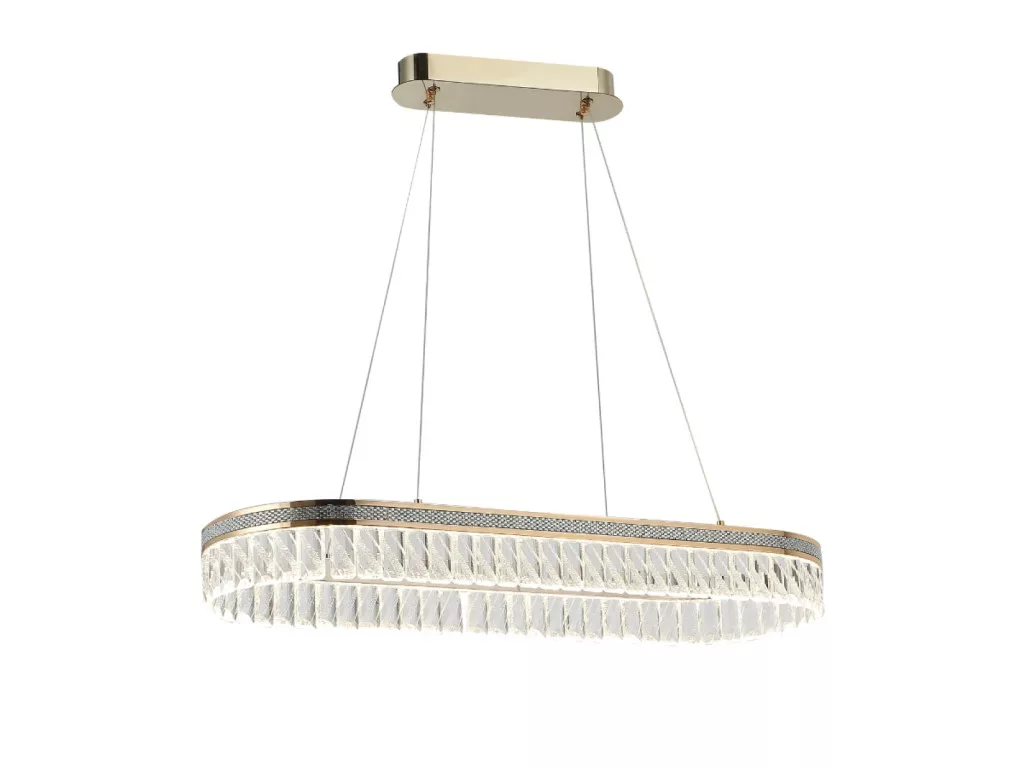 Adjon eleganciát és stílust otthona belső teréhez a THALIA N2104 dizájn függesztett lámpával! Ez a modern csillár fényes arany felülettel és díszített kristályelemekkel rendelkezik, így nappalik, étkezők vagy reprezentatív terek figyelemfelkeltő központi eleme lesz.