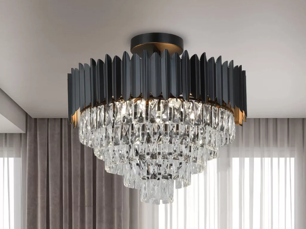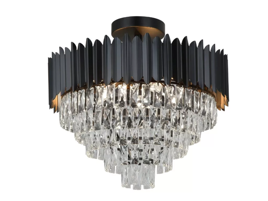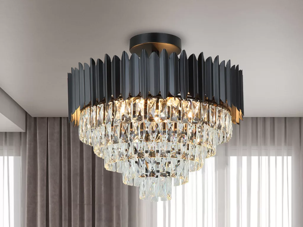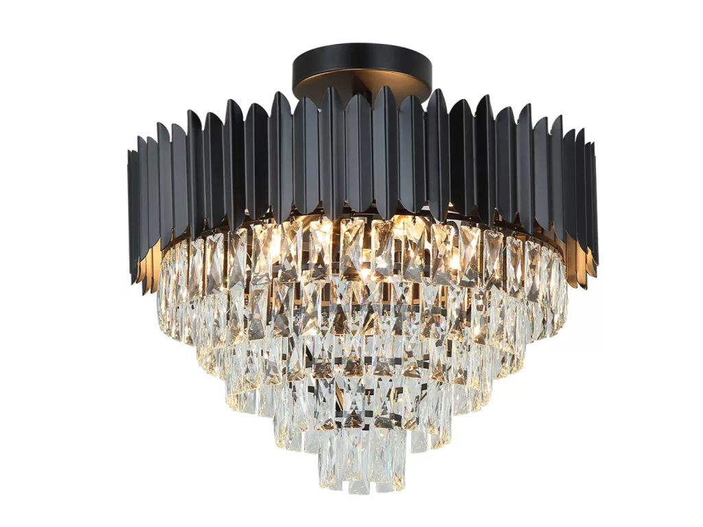 A lámpatest teste kiváló minőségű fém anyagból készül, elegáns fekete árnyalatban, díszítését finoman csiszolt kristályok adják, melyek lenyűgöző fénytörést biztosítanak és egyedi világítási élményt nyújtanak.