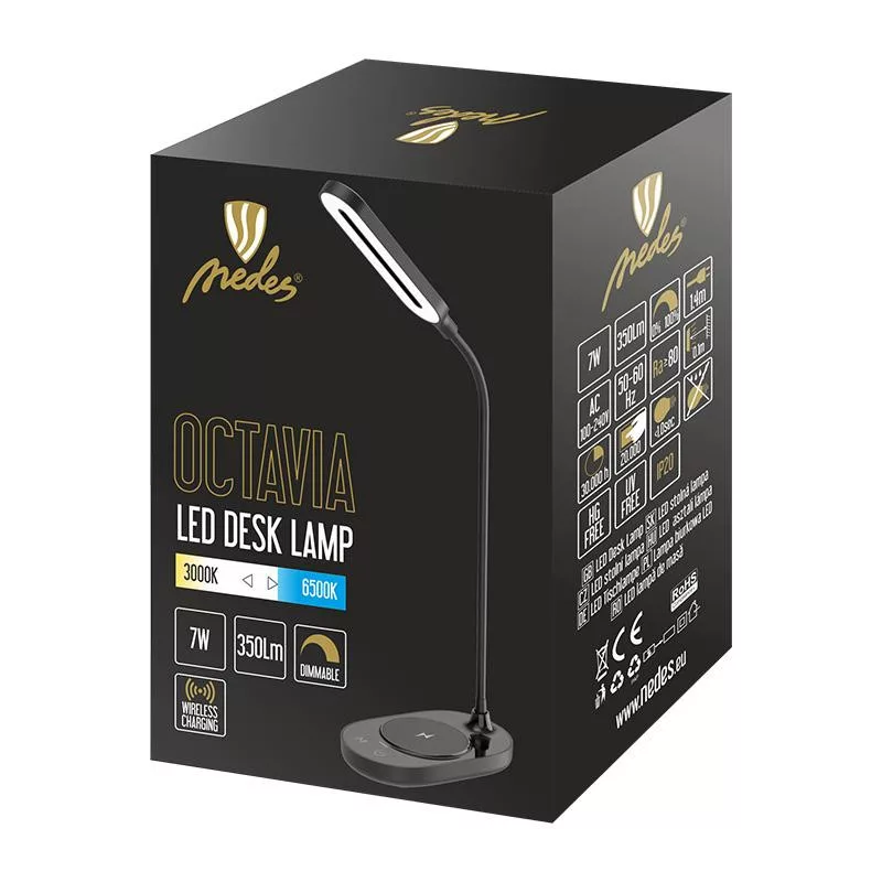 A NEDES OCTAVIA LED asztali lámpa 7W teljesítménnyel, dimmelhető és vezeték nélküli töltési funkcióval rendelkezik. Kiváló minőségű LED fénye ideális gyermek- és irodai szobákba, valamint munkahelyekre.