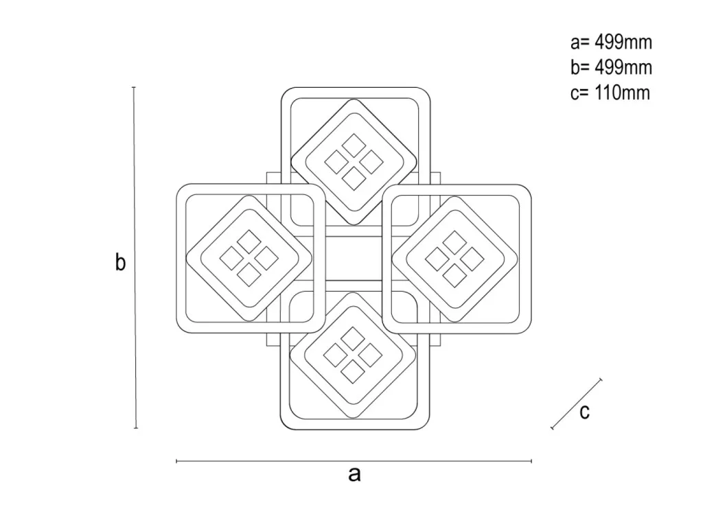 Műszaki jellemzők: 130W fogyasztás, 11400 lumen fényáram, mérete 499x499x110 mm, sugárzási szög 240°, védettség IP20, várható élettartam 30 000 óra, kapcsolási ciklusok száma 25 000, nettó tömeg 2460 g. A LED nem cserélhető, búra típusa 1.