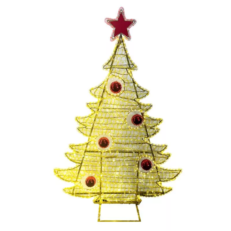 A golyós karácsonyfa tiszta vonalakkal ragyog meleg fehér fényben. Az elegáns dizájn arany árnyalatokkal és piros gömbökkel, tetején csillaggal kiegészítve varázslatos megjelenést kölcsönöz, miközben a LED-lámpák finom fényt biztosítanak.