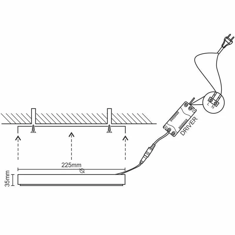 A készülék mérete Ø225 x 35 mm, fehér alumínium házzal, amely elegáns megjelenést biztosít. Az opál búra homogén fényeloszlást tesz lehetővé. A panel 120°-os sugárzási szöggel rendelkezik, mely nagy világítási területet fed le.