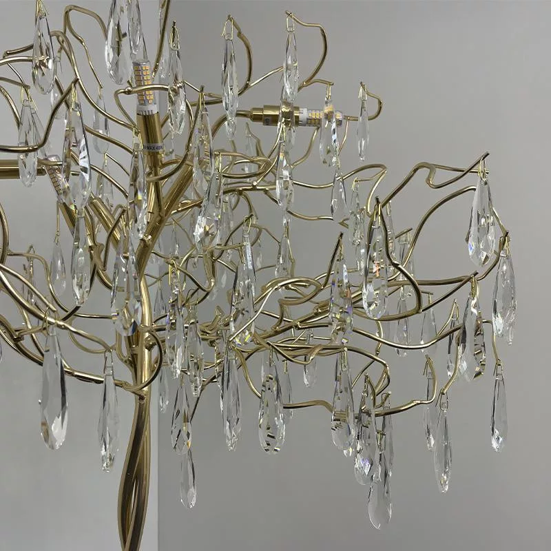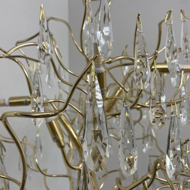 Kiváló minőségű fémből készült, francia arany színű, átlátszó kristályokkal díszítve. A lámpa erősíti a tér fényűző hangulatát, így domináns eleme lehet a modern enteriőrnek.