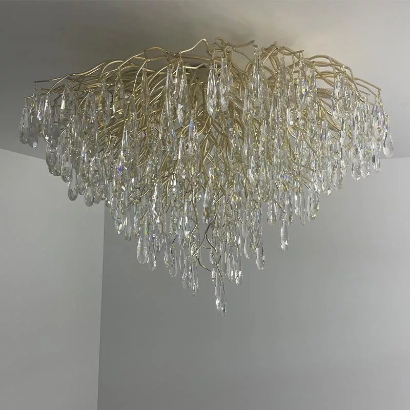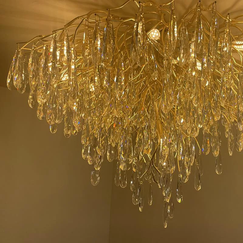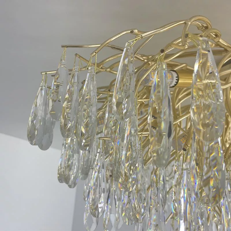 Magas minőségű fémből készült, francia arany színű kivitelben, átlátszó kristályokkal díszítve. Ez a kristály csillár a luxus légkör megteremtésének tökéletes eszköze, kiemelve a tér eleganciáját és fényűzését.