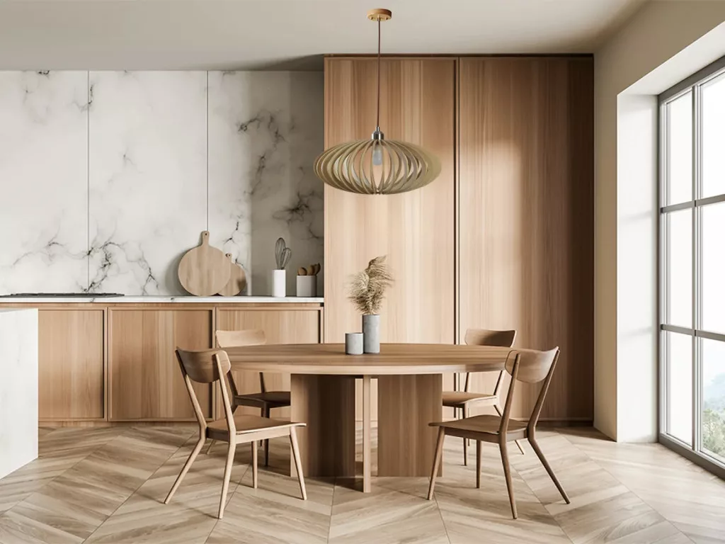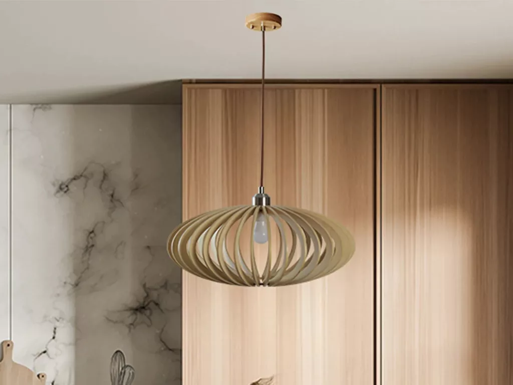 Egyszerű, problémamentes mennyezeti felszerelés biztosított, a magasság pedig állítható. A faanyag egyedisége miatt az egyes darabok mintázata eltérő lehet, a garanciális igények azonban nem terjednek ki a természetes anyagok változatosságára.